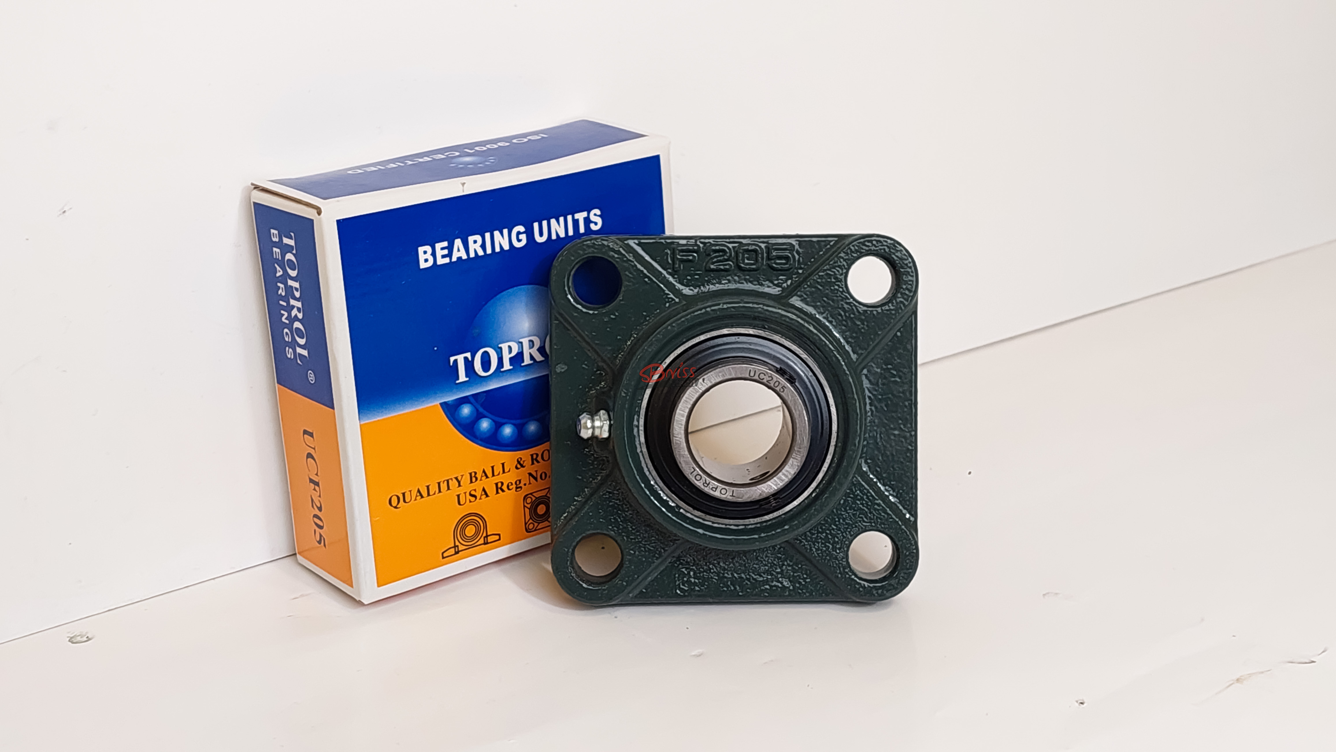 TOPROL — Zespół łożyskowy samonastawny, Oprawa żeliwna kwadratowa, łożysko kulkowe z wkrętami mocującymi, uszczelka z odrzutnikiem. Mocowanie oprawy na cztery otwory montażowe
